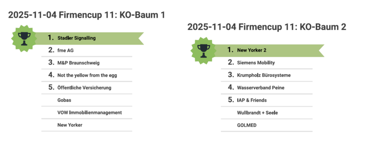 Das Profi-Feld bestand unter anderem aus drei ehemaligen Titelträgern und zwei Teams, die ihr Premieren-Turnier erleben durften. Gobas (Gewinner aus 2023) musste sich bereits im Viertelfinale dem bis dahin aktuellen Titelträger M&P Braunschweig geschlagen geben. Aber auch M&P musste schon in der nächsten Runde die Hoffnungen auf einen Titelgewinn aufgeben, da die wieder einmal stark aufspielenden Jungs von fme (Gewinner aus 2022 und Sieger im Viertelfinale gegen VOW Immobilienmanagement) im Halbfinale zwar ihre Mühe hatten, aber am Ende doch nichts anbrennen ließen. Am Ende reichte es für M&P aber noch für den dritten Platz. Im zweiten KO-Baum setzen sich zwei Neulinge im Viertelfinale gegen New Yorker und die Öffentliche Versicherung durch und spielten dann im direkten Vergleich um den Finaleinzug. Das „Not the yellow from the egg“-Team vom Planungsbüro Bartsch, das extra aus Hildesheim angereist war, musste sich Stadler Signalling geschlagen geben, die erst kurz vorher in einem firmeninternen Kickerturnier die Teilnehmer für unseren Cup ausgespielt haben.