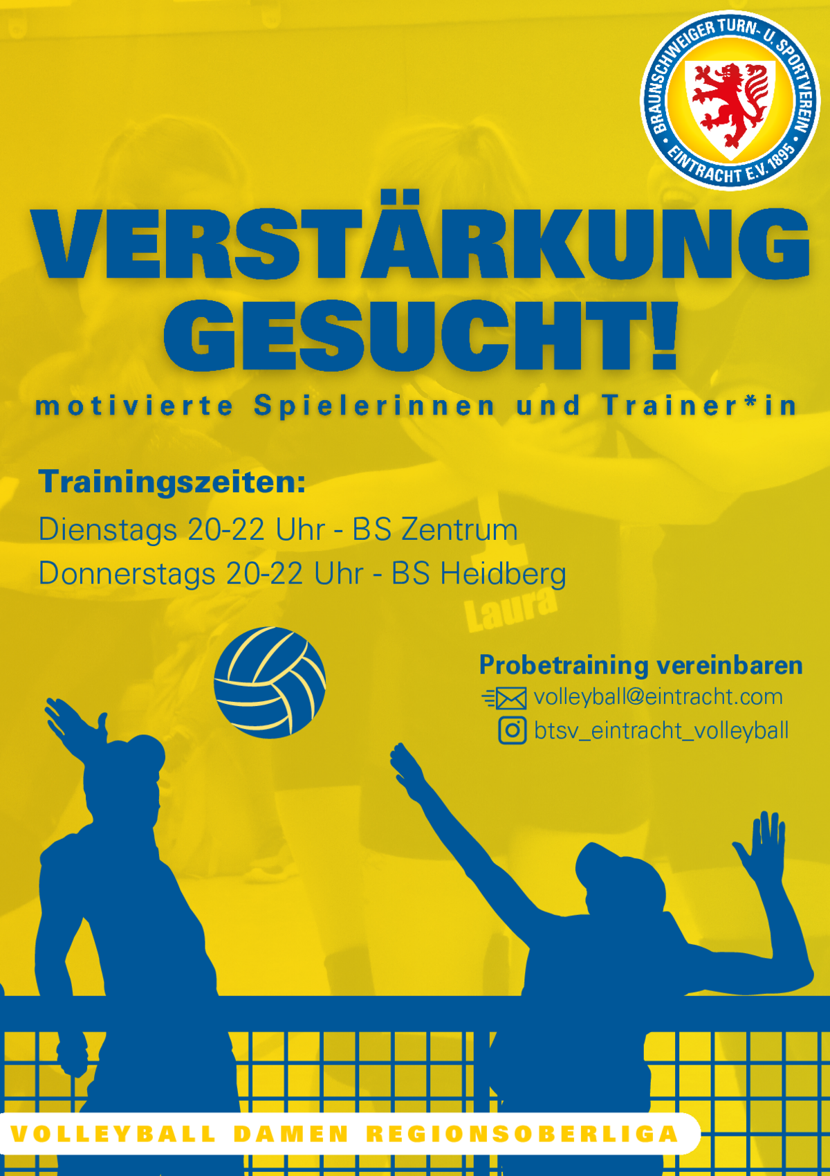 Wir sind die Volleyball-Damen des BTSV Eintracht – ein Team, das bereits seit mehreren Jahren gemeinsam spielt und auch schon wiederholt im Ligabetrieb vertreten war. Im Frühjahr 2024 haben wir die neue Volleyballsparte des BTSV Eintracht ins Leben gerufen und freuen uns, in dieser Saison wieder am Ligabetrieb teilzunehmen. Unser Team besteht aus motivierten Spielerinnen im Alter von 24 bis 39 Jahren, die sich kontinuierlich weiterentwickeln möchten. Zweimal pro Woche legen wir Wert auf ein abwechslungsreiches und intensives Training. Auch außerhalb des Spielfelds verbringen wir gerne Zeit miteinander und genießen gemeinsame Aktivitäten. Wenn du Spaß am Volleyball hast und auf der Suche nach einer Mannschaft bist, mit der du sportlich und vielleicht auch abseits des Feldes tolle Momente erleben möchtest, dann bist du bei uns genau richtig!