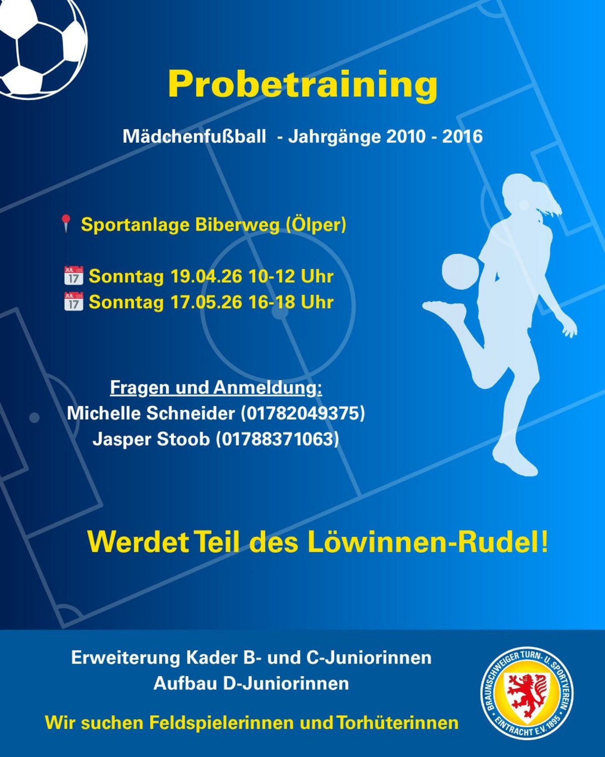 Die Juniorinnen-Abteilung von Eintracht Braunschweig lädt alle fußballbegeisterten Mädchen herzlich zum Probetraining ein. Aktuell bieten wir zwei Termine an: